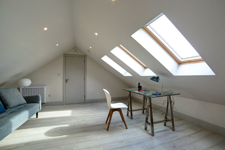 We built a new living room in the eaves and an overflow bedroom on the mezzanine level. A new open plan kitchen and living area was built and since part of the new kitchen stands in the footprint of the original house with a continuation of the same wooden floor, the new extension feels like part of the old house. A whitewashed Liscannor stone floor with under-floor heating completes the clean and contemporary feel. From a practical point of view, heating the new space meant having to upgrade to a triphase electricity cable and to install a double boiler.